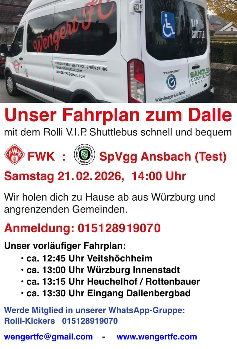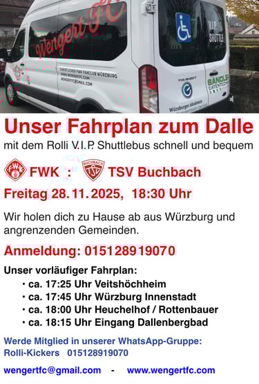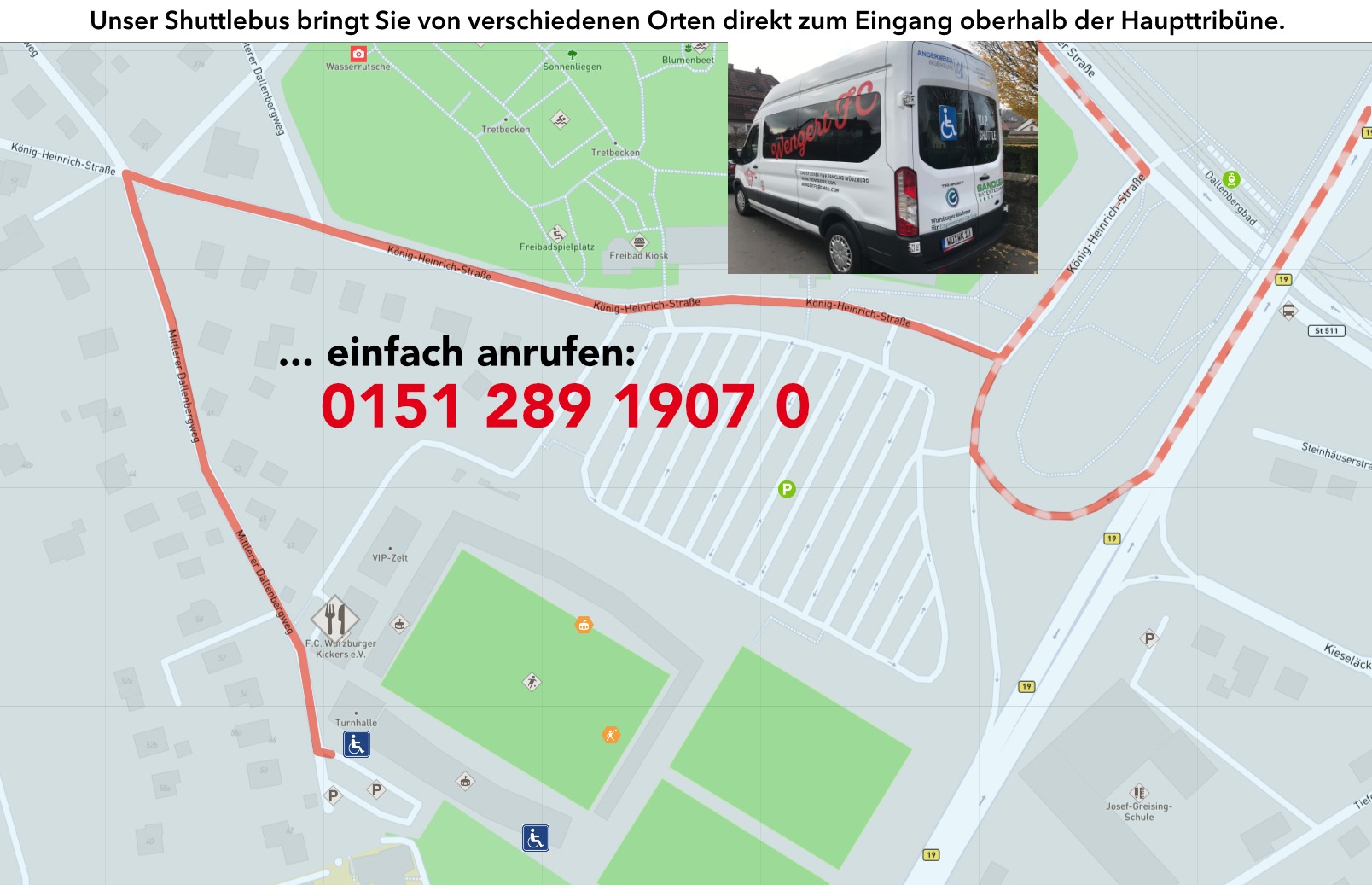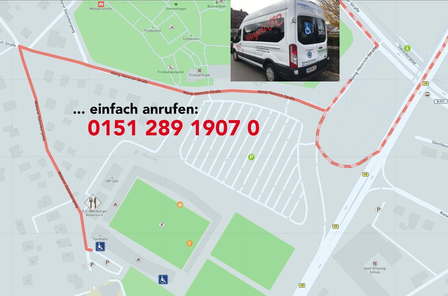 Unser Rolli-Shuttle-Bus bringt alle Rollstuhlfahrer aus Würzburg und Umgebung direkt zum Eingang oberhalb der Haupttribüne ... und wieder zurück!